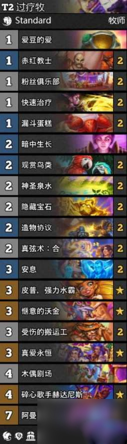 准时维斯塔然后在下两回合打出雪莲、银樽和星夜露宿等高价值法术,重复释放可以大量过牌叠甲打伤害。针对各类慢速卡组很有优势,但是面对法师和巨人贼的时候会陷入劣势。
