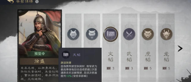 文韬:自身携带披坚执锐时,我军武力最高单体前2次普攻无法被规避,伤害提升10%(受统率影响),克制规避类阵容;