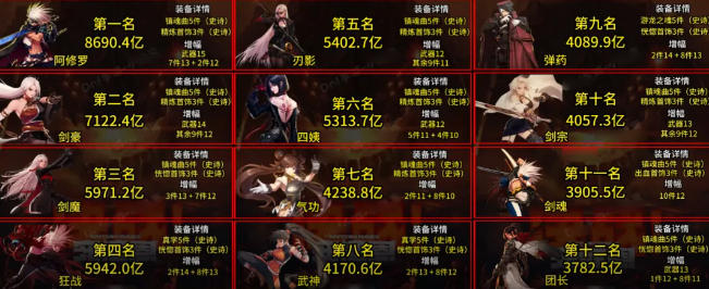 代表职业:阿修罗(排名第一,8690.4亿)、剑豪(7122.4亿)、枪炮、四姨、刃影。