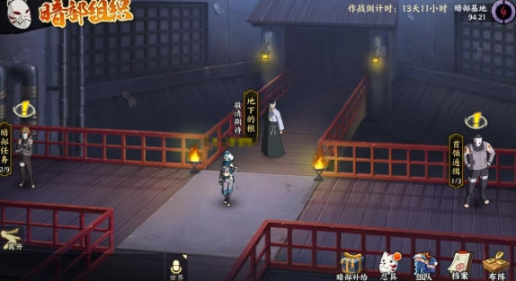 核心操作:根据自身战力接取任务,追击叛忍获取“叛忍护额”,用于提升暗部头衔等级(如新兵一段→下一级需500叛忍护额);
