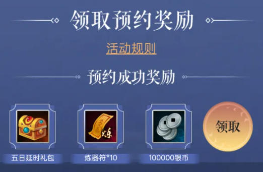 预约成功奖励(单人可领):在小程序预约并在对应新服创建角色,即可领取五日延时礼包(含666绑元)、炼器符*10、100000银币,奖励无额外门槛,创建角色后即可解锁,是新手前期养成的基础资源。