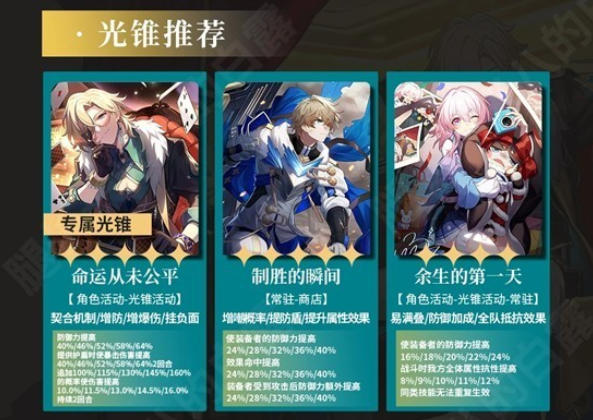 《余生的第一天》(角色活动-光锥活动-常驻):易满叠,提供防御加成与全队抵抗效果,防御力最高提升24%,我方全体属性抗性最高提升12%。