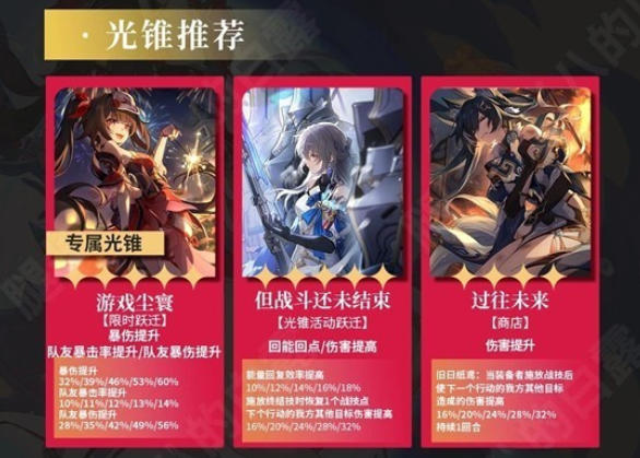 专属光锥【游戏尘寰】(限时跃迁获取):核心提升自身暴伤(满级+60%),同时给队友加14%暴击率、56%暴伤,完美契合花火暴伤转化机制,是毕业首选;