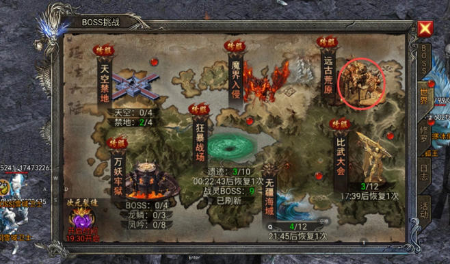 远古荒原入口:开服第4天开启,对应古宝为射日弓,6件套效果累计上限为500层,参与狂暴战场任务可提升层数上限。